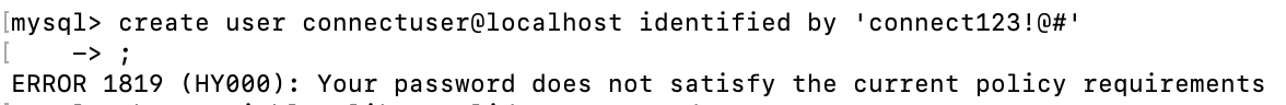 CREATE USER connectuser@localhost IDENTIFIED BY 'connect123!@#';