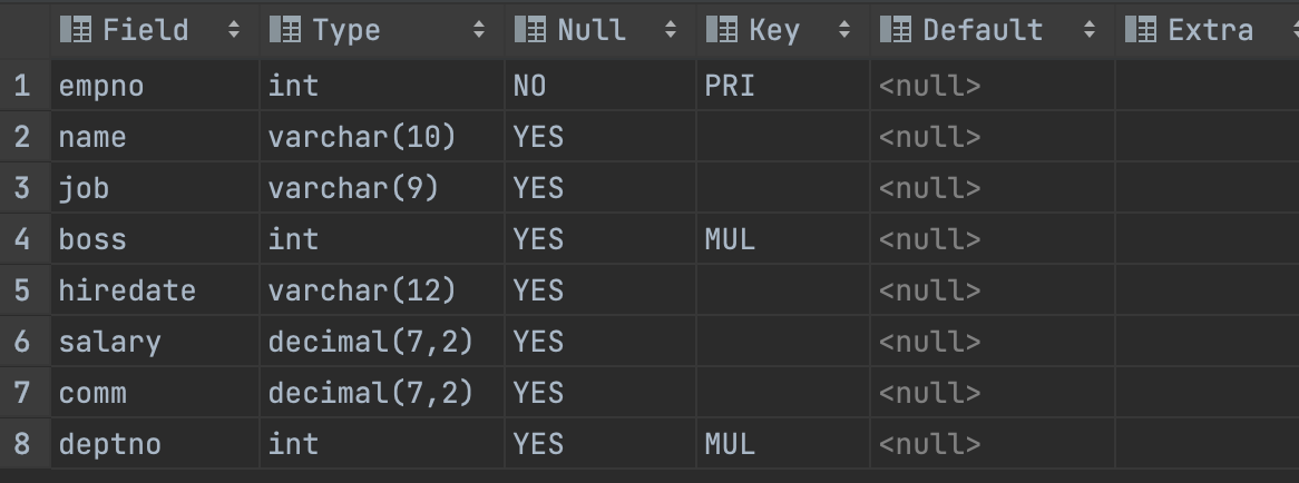 SQL [sql] 테이블 정보 확인하기 윤카일 2022. 9. 5. 19:16 desc 테이블명 - 참고로 여기서 desc는 description이다. [결과] 공유하기 게시글 관리 윤카일의 개발공간 'SQL' 카테고리의 다른 글 [sql] select 구문 예제 (0) 2022.09.05 'SQL' Related Articles [sql] select 구문 예제