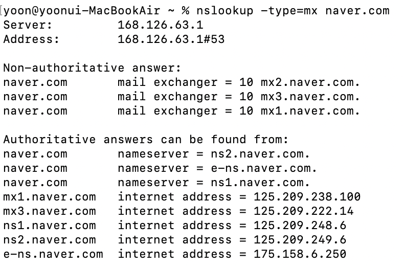 기본적으로, 도메인 네임을 입력하면 IP주소를 돌려주는데, 이는 Type=A 레코드가 명령어의 디폴트 값으로 되어 있기 때문이다.