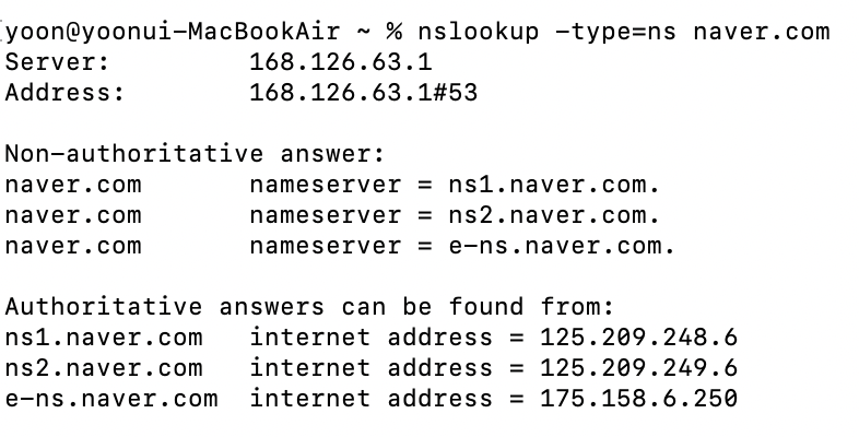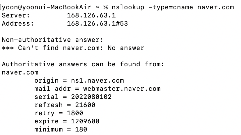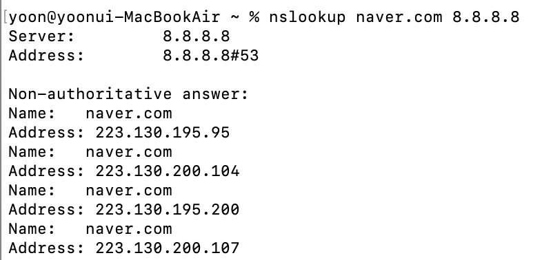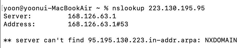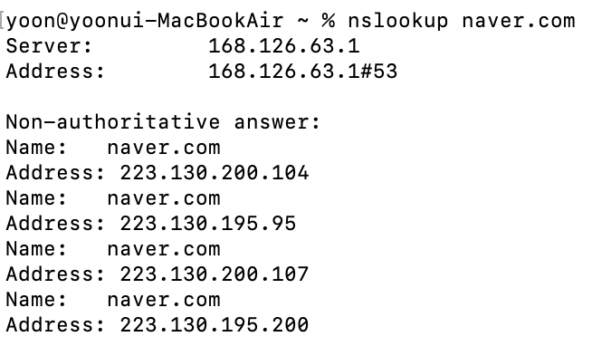 - 첫 줄에 나오는 서버 IP 주소가, 현재 DNS 클라이언트가 질의하는 로컬 DNS 서버이다
