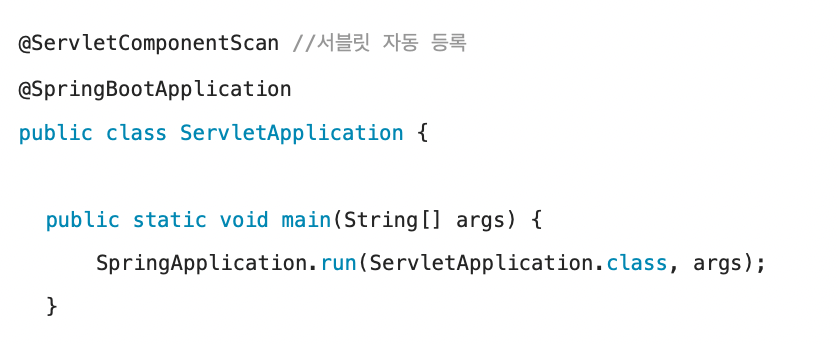 만약, 스프링부트(내장 톰캣이 있다는 뜻)에서 servlet을 사용하는 경우, 서블릿을 빈으로 등록해야 인식이 되기 때문에, Application 코드 부분에 서블릿을 자동으로 등록해주는 @ServletComponentScan 을 추가해주어야 한다.