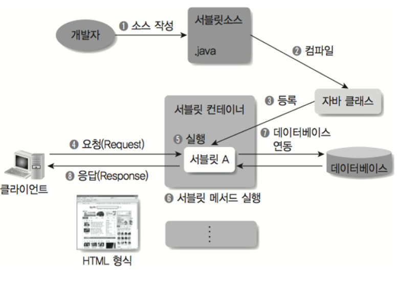 서블릿은 자바 클래스로, 웹 애플리케이션을 작성한 뒤 이후 웹 서버 안에 있는 웹 컨테이너에서 이것을 실행하고, 웹 컨테이너에서는 서블릿 인스턴스를 생성 후 서버에서 실행되다가 웹 브라우저에서 서버에 요청(Request)을 하면 요청에 맞는 동작을 수행하고 웹 브라우저에 HTTP형식으로 응답(Response)합니다.