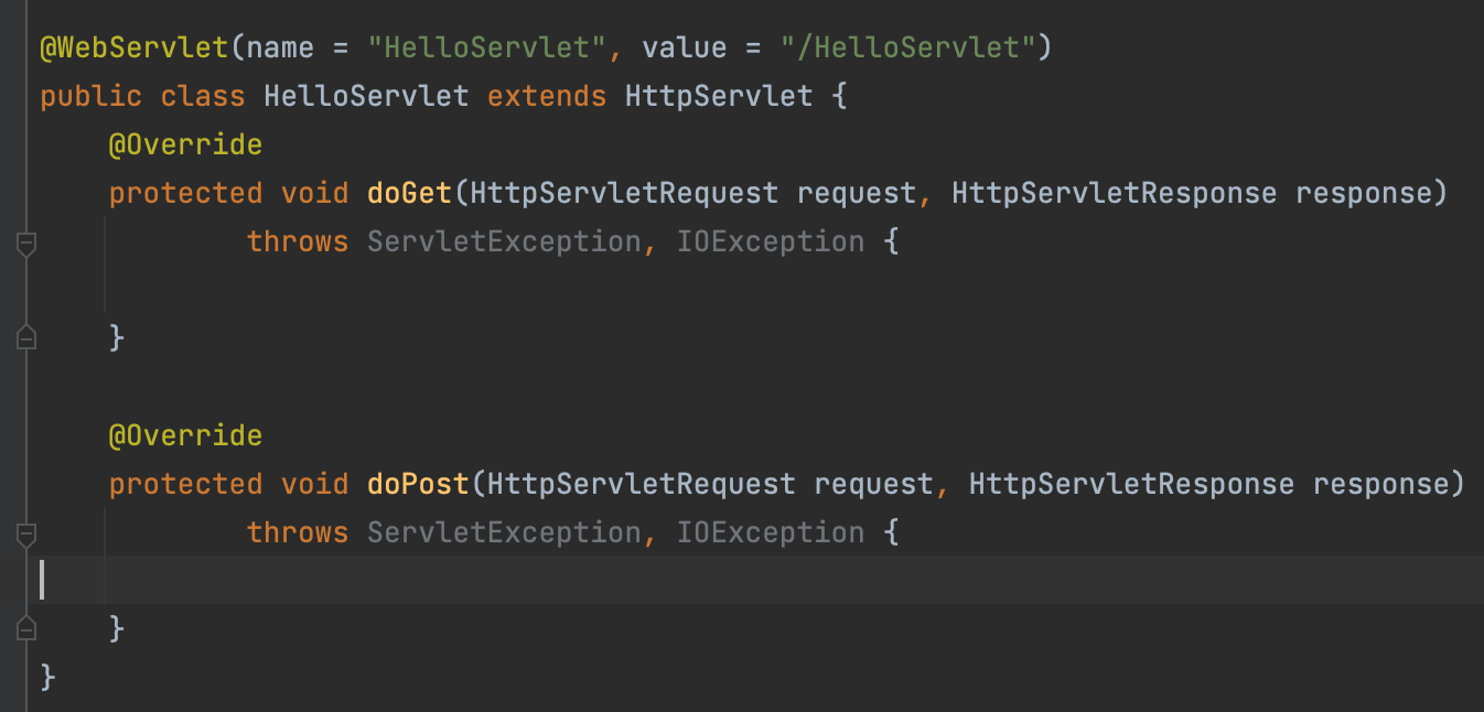 인텔리제이에서 cmd+n 을 통해 새로운 Servlet을 만들면, 아래와 같은 구조를 보여준다.