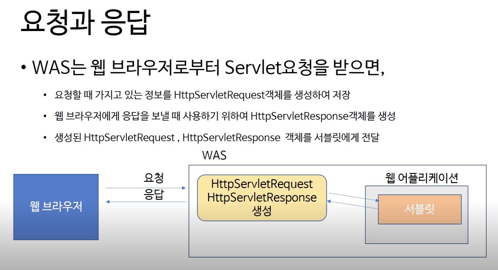 - WAS는 어떤 클라이언트가 요청을 보냈는지 알고 있고, 해당 클라이언트에게 응답을 보내기 위한 HttpServleResponse객체를 생성하여 서블릿에게 전달합니다.