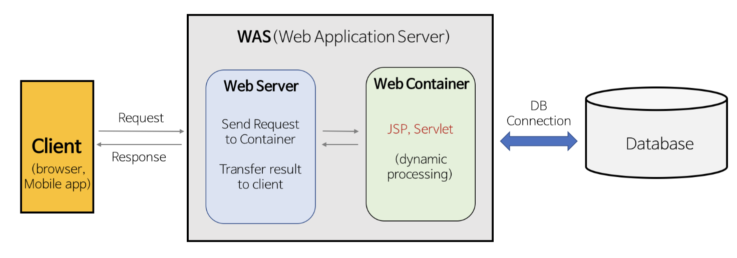 - 즉, WAS는 JSP, Servlet 구동 환경을 제공한다.