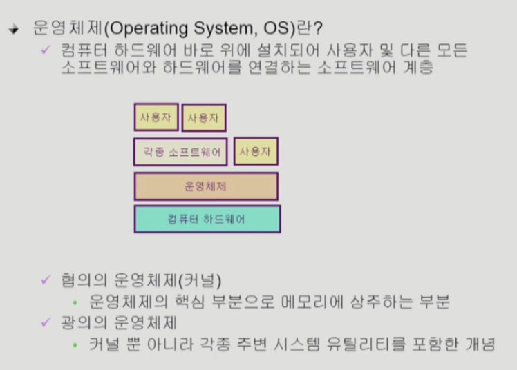 - 뇌를 통해 인간의 신체를 통제하듯이, 운영체제가 컴퓨터 하드웨어를 통제한다.(하드웨어 개별적으로는 고철덩어리에 불과)