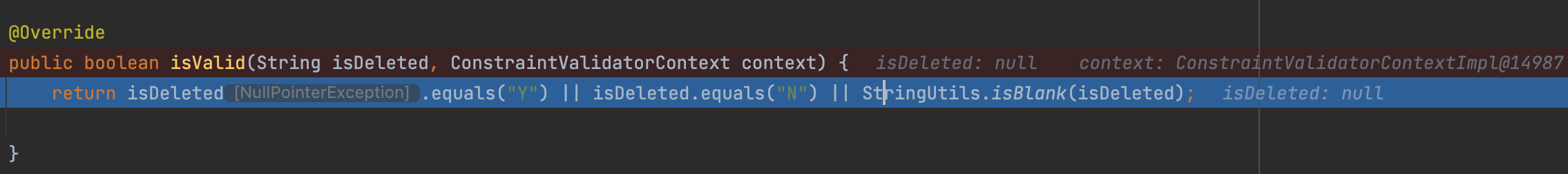 isDeleted field에, "Y", "N", null 값만 들어올 수 있도록 지정했기 때문에, NPE가 생기는 것이 이상해서 debugging을 진행하였다. 문제는, isDeleted field의 값을 체크하는 것을 null부터 하지 않았던 것이였다. null일 경우에, 이미 앞에서 equals 메소드를 진행할 때 NPE가 나버리기 때문이다.